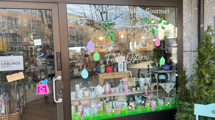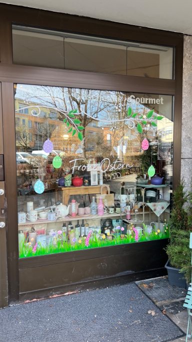 Die Idee war eine leichte, frühlingshafte Gestaltung, die das Schaufenster dekorativ ergänzt, ohne die schöne Dekoration im Laden zu überdecken.