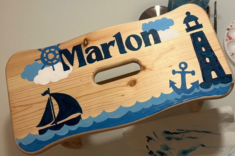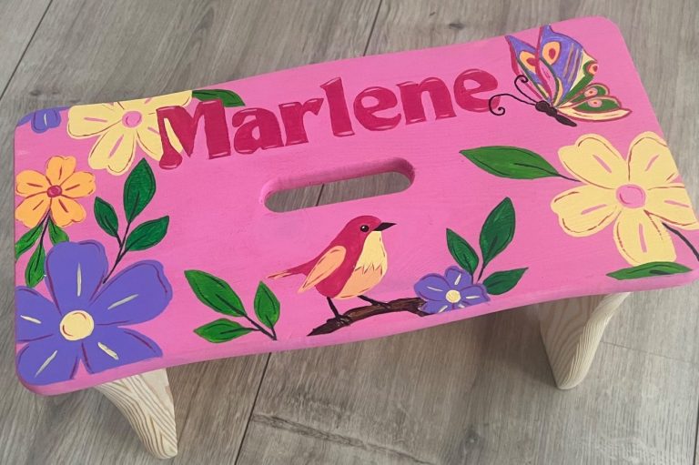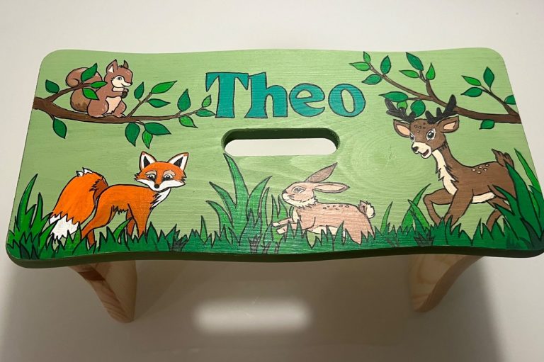 Ob Waldtiere, Blumen, Fahrzeuge oder Lieblingsfarben – ich gestalte den Kinderhocker individuell mit Namen und Wunschmotiv.