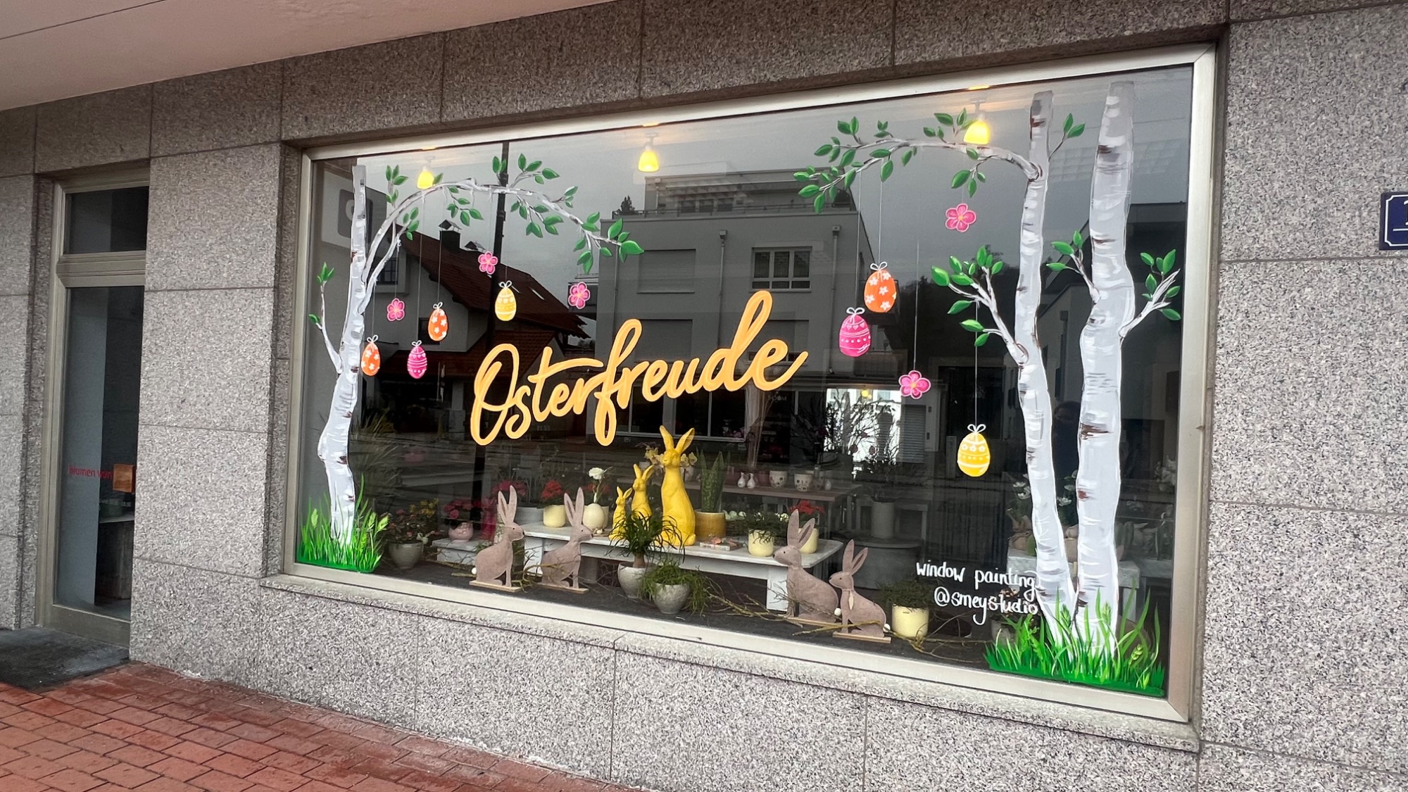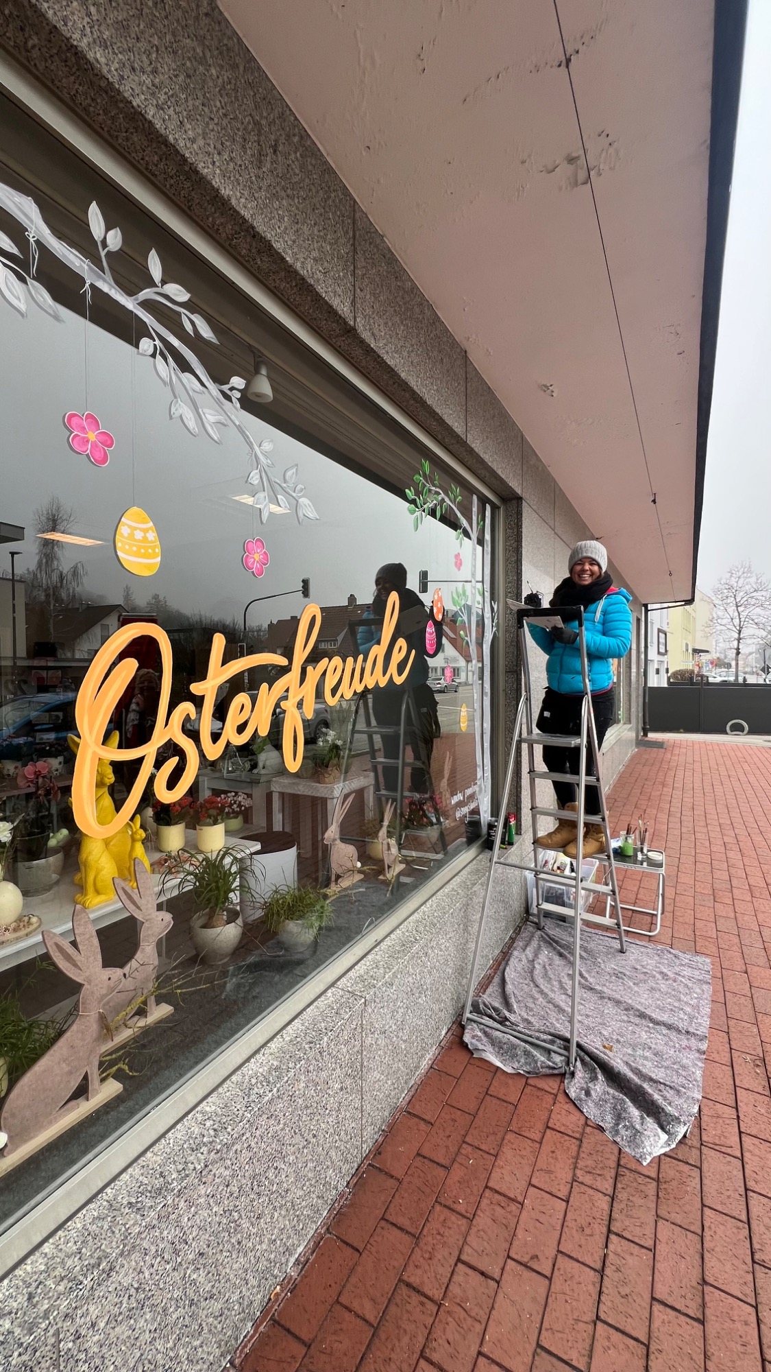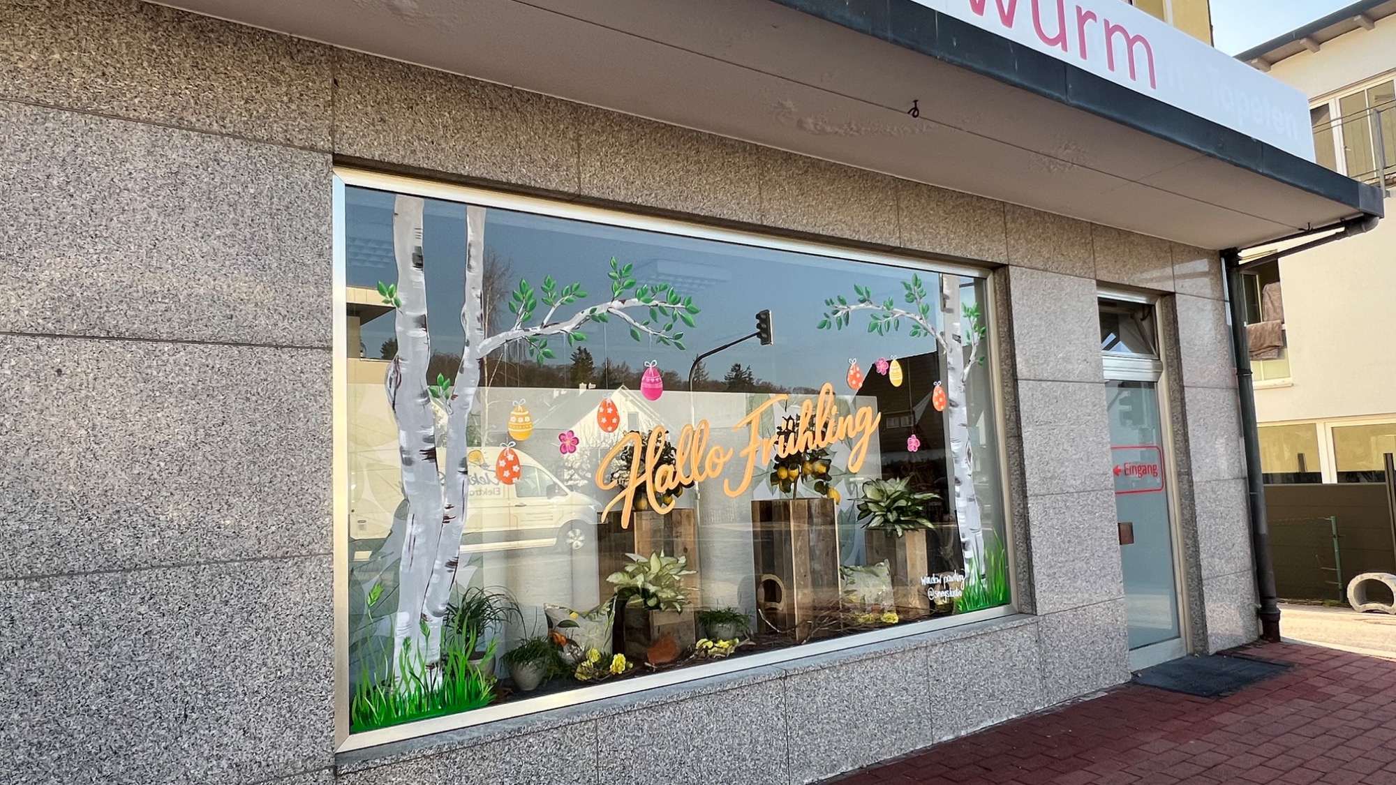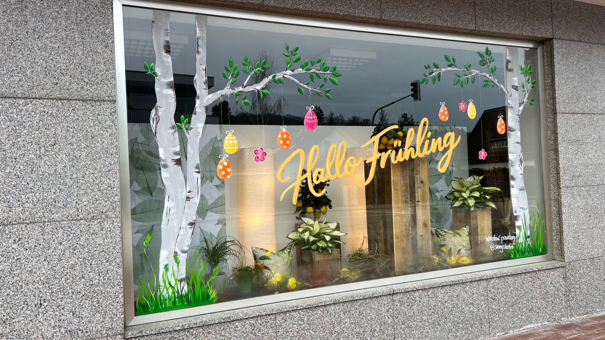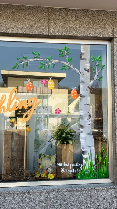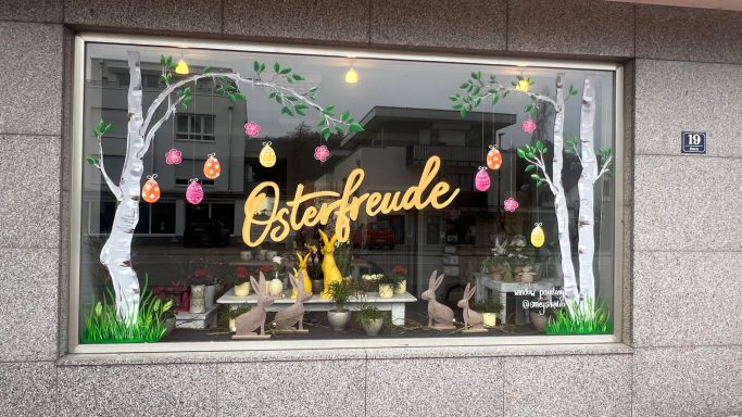 Passend zum Frühling und zu Ostern durften nun frische grüne Blätter an den Birken wachsen, wodurch die Fenster sofort eine lebendige Frühlingsstimmung bekommen. Ergänzt wurde die Gestaltung durch hängende Ostereier, lockere Gräser am unteren Fensterrand sowie zwei frühlingshafte Schriftzüge: Auf einem Fenster steht „Osterfreude“, auf dem anderen „Hallo Frühling“.